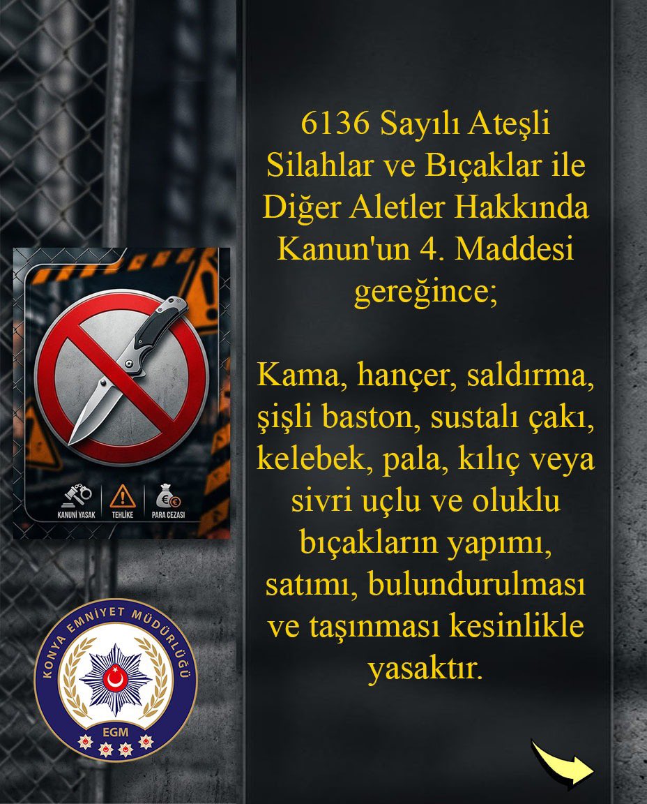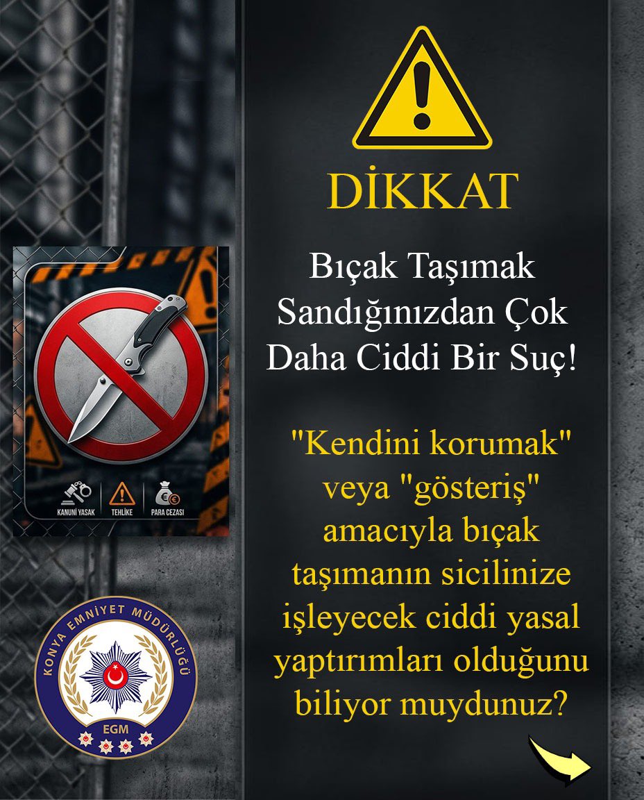 Konya İl Emniyet Müdürlüğü, bıçak taşımanın ciddi hukuki sonuçlar doğurabileceğine dikkat çekerek vatandaşları uyardı.