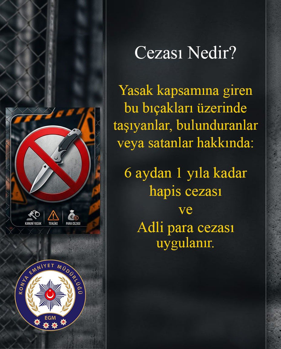 Konya İl Emniyet Müdürlüğü, yasaklı bıçakların taşınmasının ciddi yaptırımlara yol açtığını belirterek vatandaşları uyardı. İşte ihlal edenlerin karşılaşacağı hapis ve para cezaları…