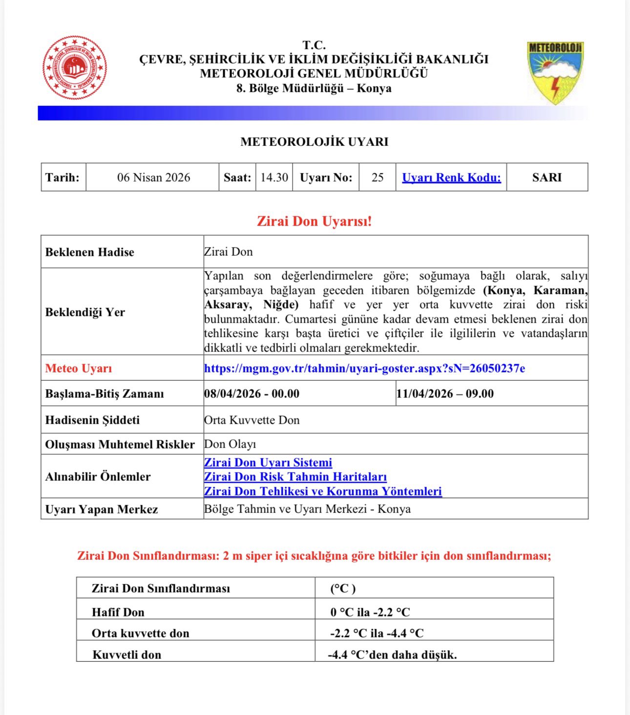 Zirai don olayının 8 Nisan 2026 saat 00.00’dan itibaren başlayarak 11 Nisan 2026 saat 09.00’a kadar etkisini sürdürmesi öngörülüyor.