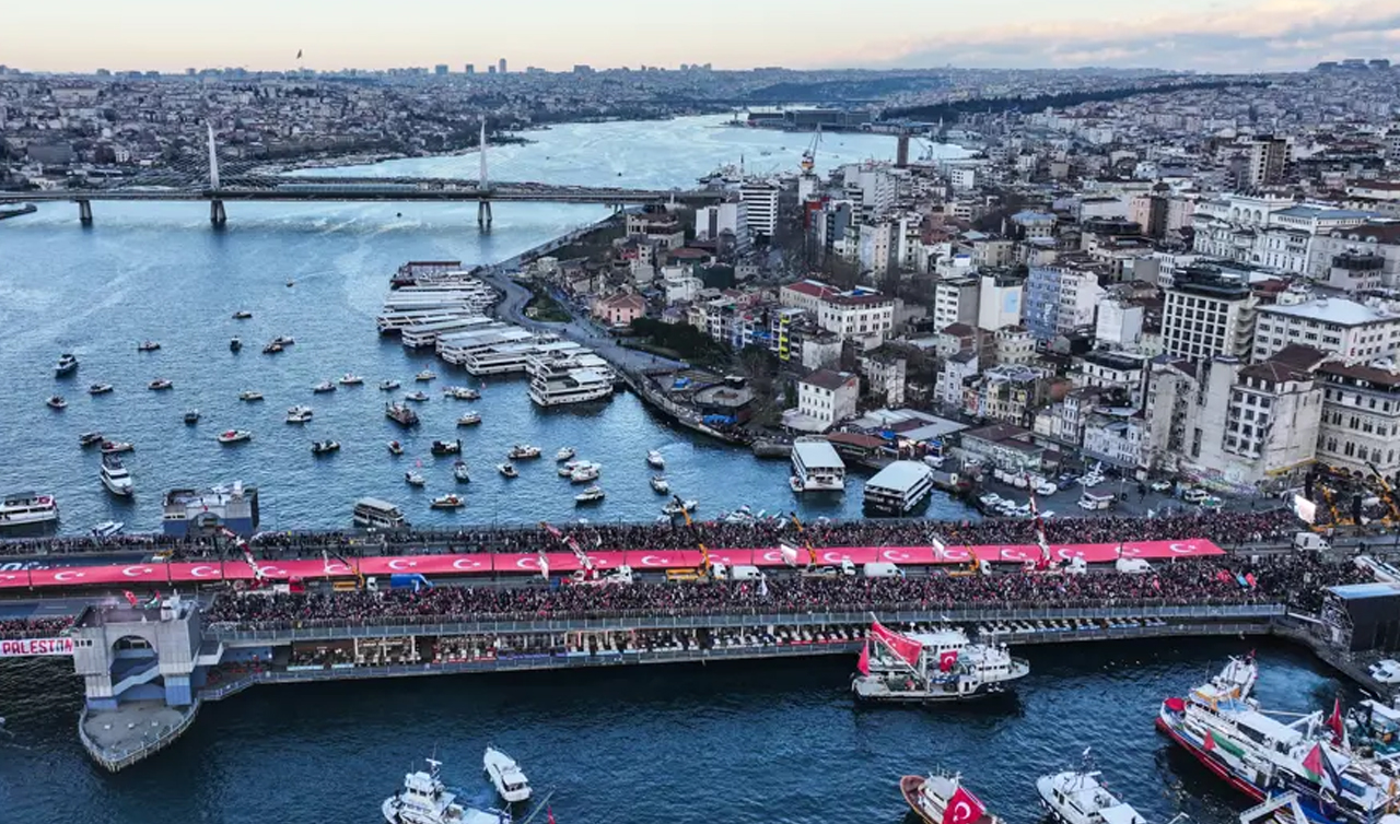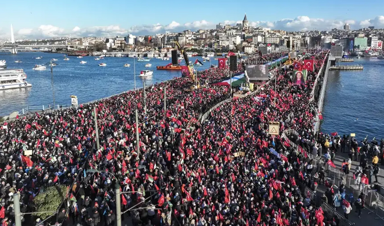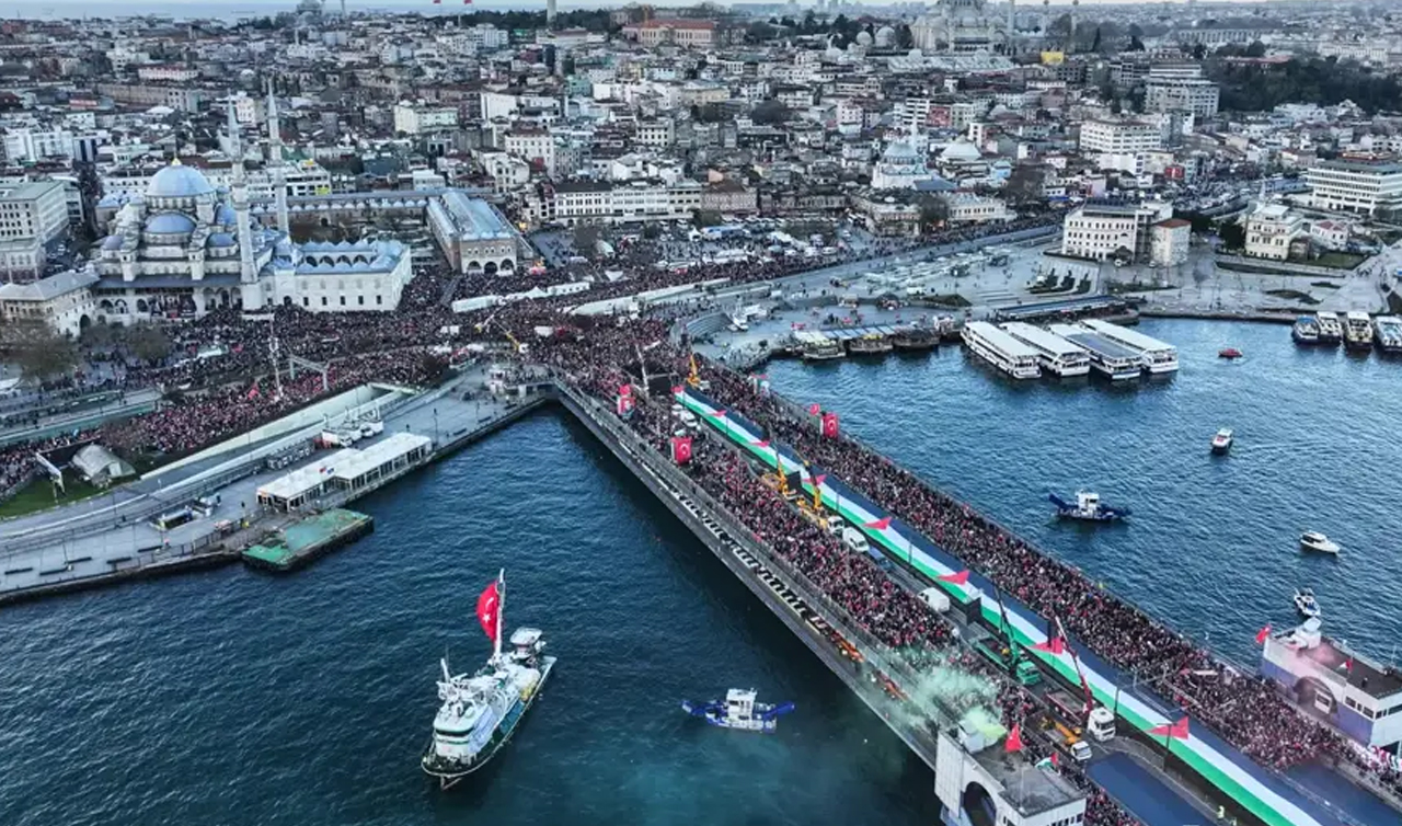İstanbul Galata Köprüsü'nde Gazze için düzenlenen eyleme yaklaşık 520 bin kişi katıldı. Köprüye akın eden vatandaşlar Filistin'e destek mesajları verdi.
